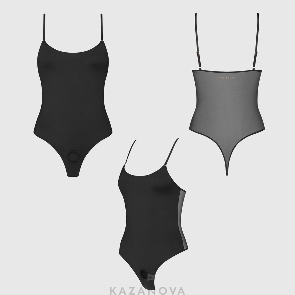 Спереди мягкая микрофибра плавно облегает тело, создавая ощущение второй кожи. Сзади прозрачная сетка добавляет визуальную лёгкость и интригу, а золотой тиснёный логотип служит изящным акцентом.