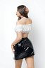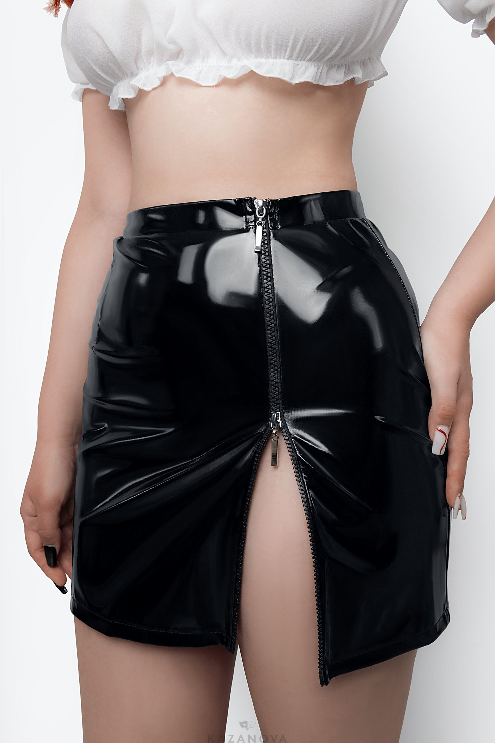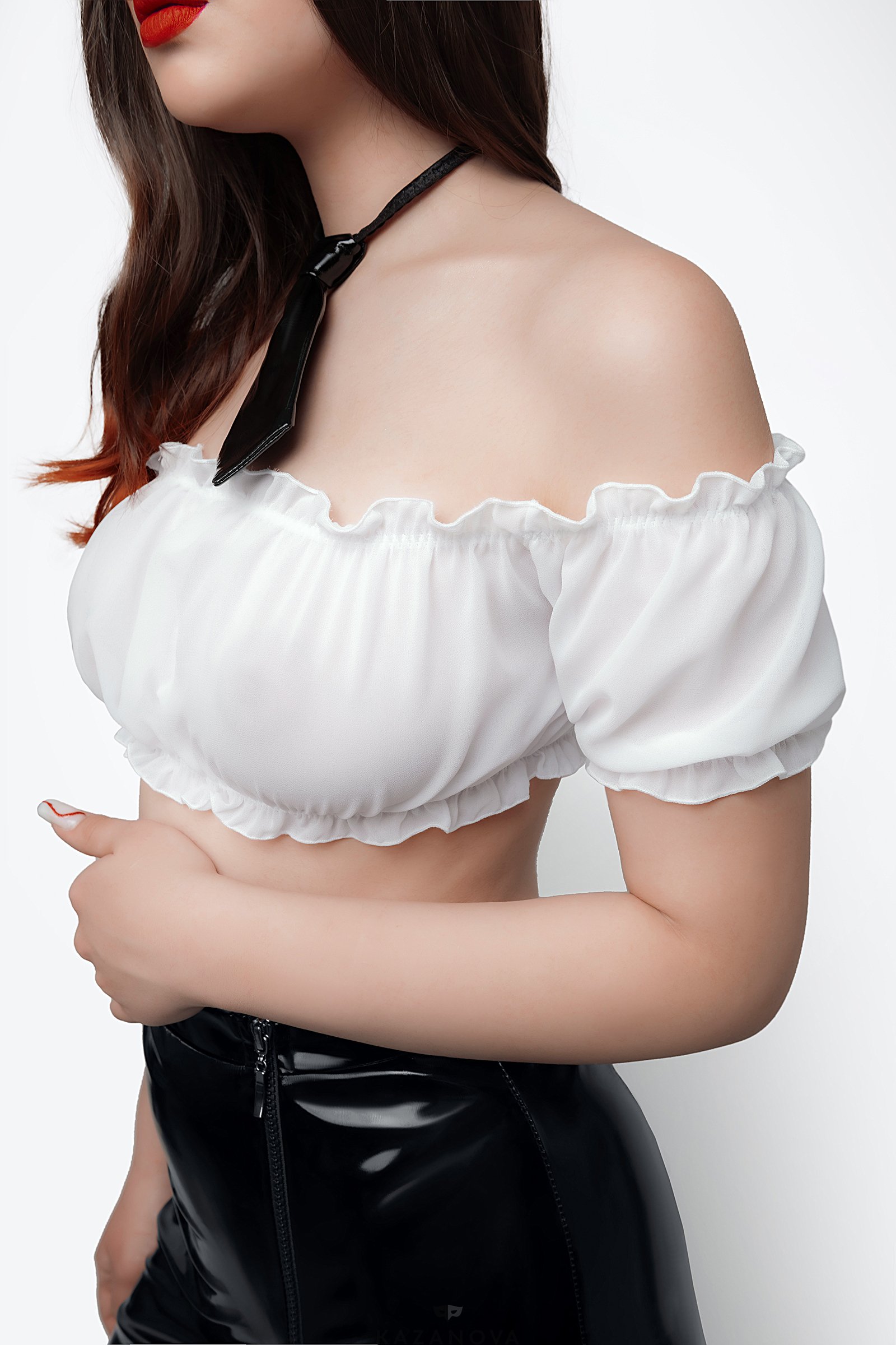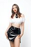 Прямая юбка из трикотажной лаковой кожи скрывает живот, даёт небольшую коррекцию силуэта, подчеркивает талию и бедра. Двусторонняя молния спереди визуально удлиняет ноги и добавляет элемент игры - скинуть юбку можно в одно мгновение. Невесомый прозрачный топ из шифона придает груди соблазнительный объем, подчеркивает ключицы и декольте, не сковывает движений. Рукава-фонарики дают возможность прикрыть плечи или наоборот - добавить образу обнаженности. Галстук на эластичной резинке с небольшим крючком сзади завершает образ и придаёт кокетства.