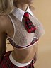 Костюм школьницы от Le Frivole воплощает это идеально: кружевной топ на косточках подчеркивает грудь, добавляя соблазнительности, а короткая юбка-пояс с подтяжками для чулок привносит игривую дерзость, открывая пространство для фантазий. И, конечно, воротник с галстуком — финальный штрих, который завершает этот образ и добавляет характер.