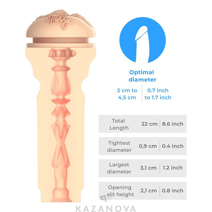 Сам мастурбатор создан из материала Superskin, похожего на кожу и имеет автограф Molly рядом с отверстием. Он очень прост в уходе и может быть легко извлечен из удобного пластикового корпуса для очистки.