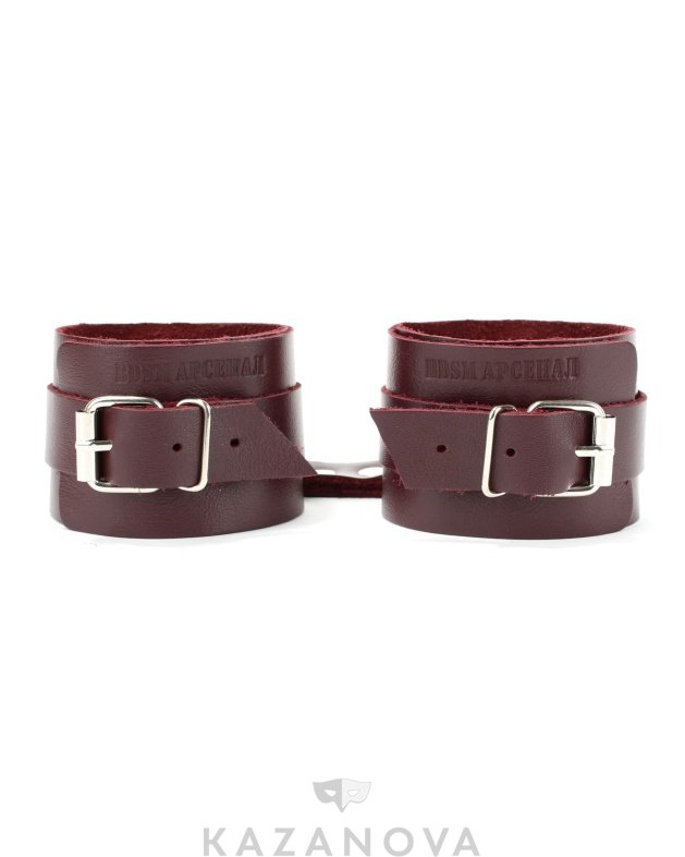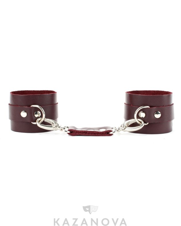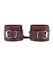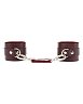 Поножи изготовлены из натуральной кожи бордового цвета и декорированы металлическими элементами.